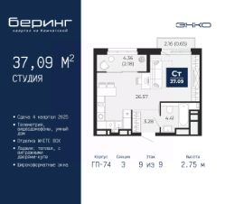 Продается однокомнатная квартира-студия в ЖК "Беринг" на 9 этаже. Квартира без отделки, новый собственник может сделать ремонт по индивидуальному дизайн-проекту. Общая площадь: 37.09 кв.м., площадь гостиной 26.57 кв.м., из которых 5 кв.м. выделено под кухонную зону. Все окна выходят на одну сторону. В квартире один балкон и одна лоджия, один совмещенный санузел. Высота потолков 2.75 м.