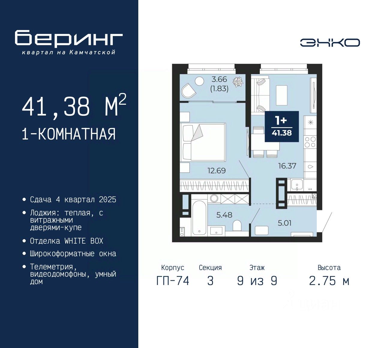 Просторная 1-комн. квартира с предчистовой отделкой в ЖК "Беринг" на 9 этаже. Общая площадь: 41.38 кв.м., жилая: 12.69 кв.м., площадь просторной кухни-столовой: 16.37 кв.м. Все окна выходят на одну сторону. В квартире одна лоджия, один совмещенный санузел. Высота потолков 2.75 м.