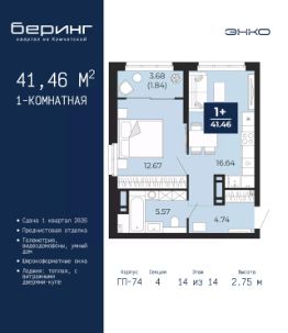 1-комн. квартира от застройщика с предчистовой отделкой в ЖК "Беринг" на 14 этаже. Общая площадь: 41.46 кв.м., жилая: 12.67 кв.м., площадь просторной кухни-столовой: 16.64 кв.м. Все окна выходят на одну сторону. В квартире одна лоджия, один совмещенный санузел. Высота потолков 2.75 м.