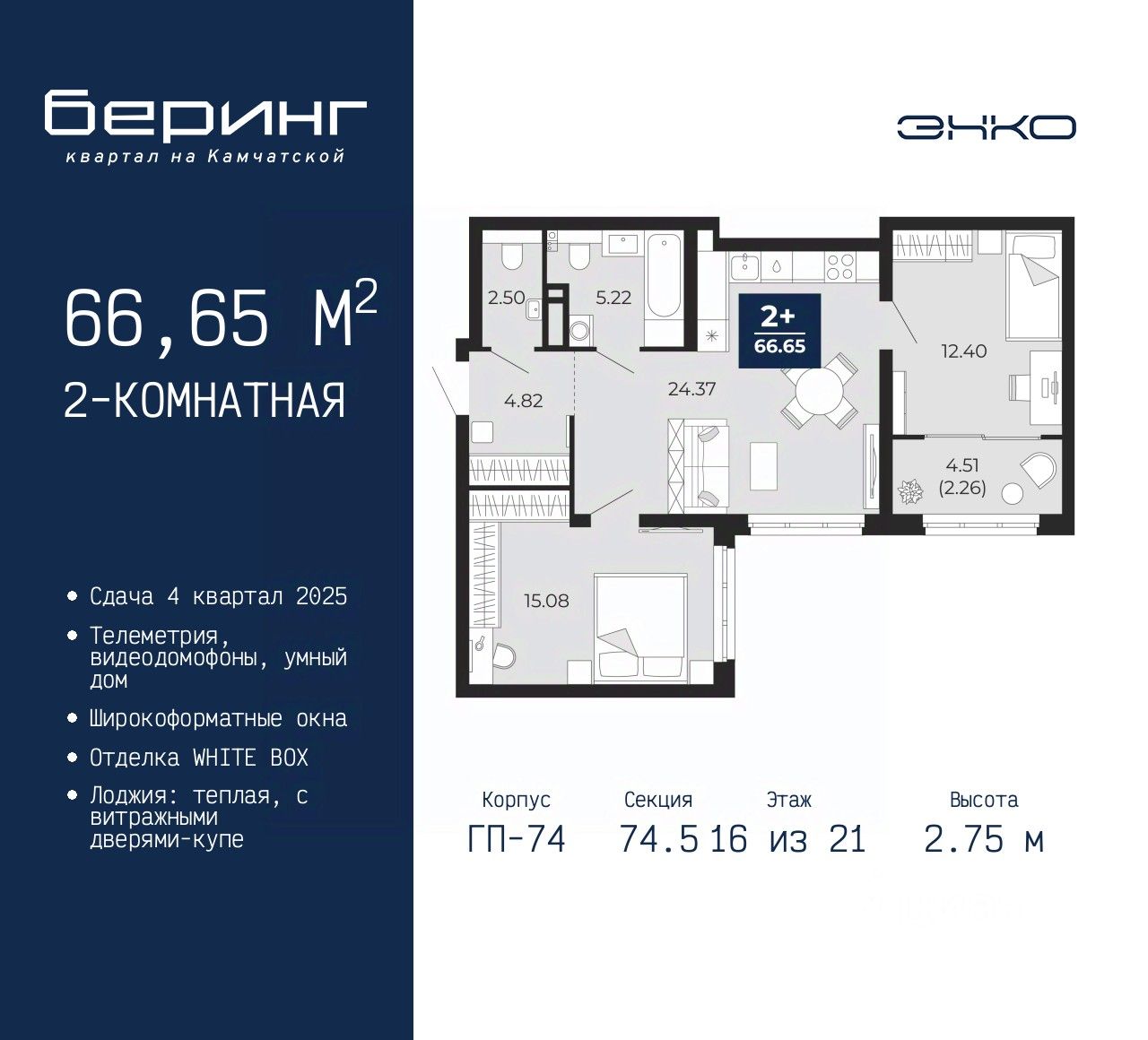 2-комн. квартира в ЖК "Беринг" на 16 этаже. Квартира без отделки, полностью готова к ремонту. Общая площадь: 66.65 кв.м., жилая: 27.48 кв.м., площадь просторной кухни-столовой: 24.37 кв.м. Квартира угловая, идеально подойдет любителям тишины и панорамных видов. В квартире одна лоджия, один совмещенный и один раздельный санузел. Высота потолков 2.75 м.