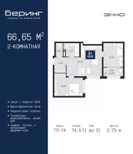 Продается 2-комн. квартира от застройщика с предчистовой отделкой в ЖК "Беринг" на 11 этаже. Общая площадь: 66.65 кв.м., жилая: 27.48 кв.м., площадь просторной кухни-столовой: 24.37 кв.м. Угловая квартира, очень светлая, естественная вентиляция при открытии окон. В квартире одна лоджия, один совмещенный и один раздельный санузел. Высота потолков 2.75 м.