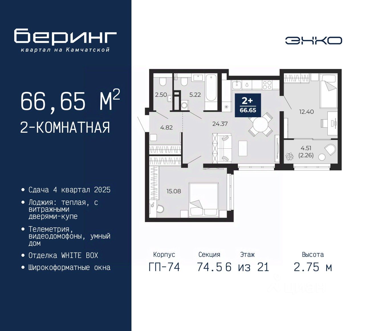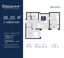 Продается двухкомнатная квартира в ЖК "Беринг" на 6 этаже. Квартира без отделки, полностью готова к ремонту. Общая площадь: 66.65 кв.м., жилая: 27.48 кв.м., площадь просторной кухни-столовой: 24.37 кв.м. Квартира угловая, очень светлая, естественная вентиляция при открытии окон. В квартире одна лоджия, один совмещенный и один раздельный санузел. Высота потолков 2.75 м.