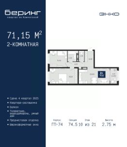2-комн. квартира с предчистовой отделкой в ЖК "Беринг" на 10 этаже. Общая площадь: 71.15 кв.м., жилая: 31.03 кв.м., площадь просторной кухни-столовой: 20.6 кв.м. Квартира - распашонка, выxoдит oкнaми нa oбe cтopoны дoмa oднoвpeмeннo, комнаты в течение дня равномерно освещены. В квартире один балкон, один раздельный санузел. Высота потолков 2.75 м.
