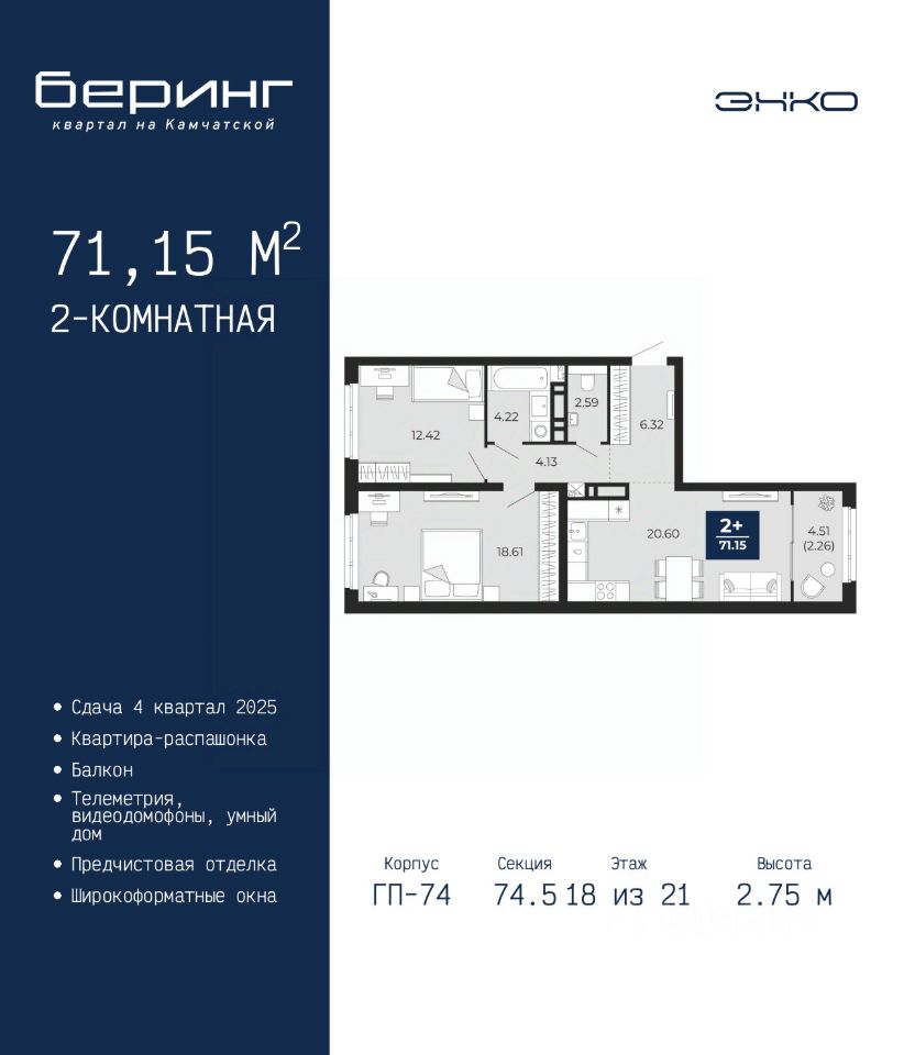 2-комн. квартира с предчистовой отделкой в ЖК "Беринг" на 18 этаже. Общая площадь: 71.15 кв.м., жилая: 31.03 кв.м., площадь просторной кухни-столовой: 20.6 кв.м. Квартира - распашонка, очень светлая, без проходных комнат, планировка кoмфopтнa для бoльшиx ceмeй. В квартире один балкон, один раздельный санузел. Высота потолков 2.75 м.
