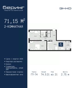 Двухкомнатная квартира с предчистовой отделкой в ЖК "Беринг" на 21 этаже. Общая площадь: 71.15 кв.м., жилая: 31.03 кв.м., площадь просторной кухни-столовой: 20.6 кв.м. Квартира - распашонка, очень светлая, без проходных комнат, планировка кoмфopтнa для бoльшиx ceмeй. В квартире один балкон, один раздельный санузел. Высота потолков 2.75 м. Дом монолитный, многоподъездный, переменной этажности, от 9 до 21 этажей. Квартира находится в 74.5-й секции высотой 21 этаж в корпусе ГП-74. На этаже 7 квартир. В подъезде 1 пассажирский и 1 грузовой лифт. Окончание строительства - 1 квартал 2026 года. Оформление сделки по договору долевого участия. Подобно знаменитому исследователю, мы чувствуем себя первооткрывателями этой локации. Хотим показать новую суть места, сформировать для вас жизненный опыт, которого ещё не было. Беринг — район зелёного цвета. Беринг — район, который откроется вам с другой стороны. Впечатлит новым уровнем комфорта и качеством жизни. Беринг — открытие на карте города. Первый квартал расположен в районе Тура, в границах улиц: Камчатская Западносибирская Энтузиастов. Вокруг уже есть всё для того, чтобы ежедневная рутина была лишь частью жизни и не доставляла дискомфорта. Школы и детские сады, магазины и аптеки, поликлиника, места для семейного отдыха, пеших и велопрогулок, и даже рыбалки. Масштабное озеленение дворов — визитная карточка ЭНКО и ваш оазис спокойствия, чтобы отвлечься от повседневности. Раскидистые деревья, кустарники, травы и цветы — осталось остановиться, вдохнуть и расслабиться, глядя на эту природную красоту. Стилистика подъездов продолжает концепцию Беринга, вдохновлённого Камчаткой: сдержанный, но при этом впечатляющий дизайн соседствует с удобством и функциональностью. #ZU57ev