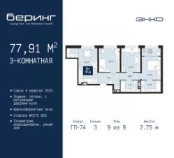 Трехкомнатная квартира в ЖК "Беринг" на 9 этаже. Квартира без отделки, после оформления собственности можно делать ремонт. Общая площадь: 77.91 кв.м., жилая: 34.78 кв.м., площадь просторной кухни-столовой: 19.45 кв.м. Комнаты изолированные, все окна выходят на одну сторону. В квартире одна лоджия, два совмещенных санузла. Высота потолков 2.75 м.