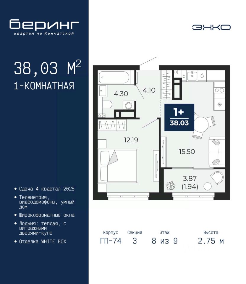 Продается 1-комн. квартира в ЖК "Беринг" на 8 этаже. Квартира без отделки, полностью готова к ремонту. Общая площадь: 38.03 кв.м., жилая: 12.19 кв.м., площадь просторной кухни-столовой: 15.5 кв.м. Все окна выходят на одну сторону. В квартире одна лоджия, один совмещенный санузел. Высота потолков 2.75 м.