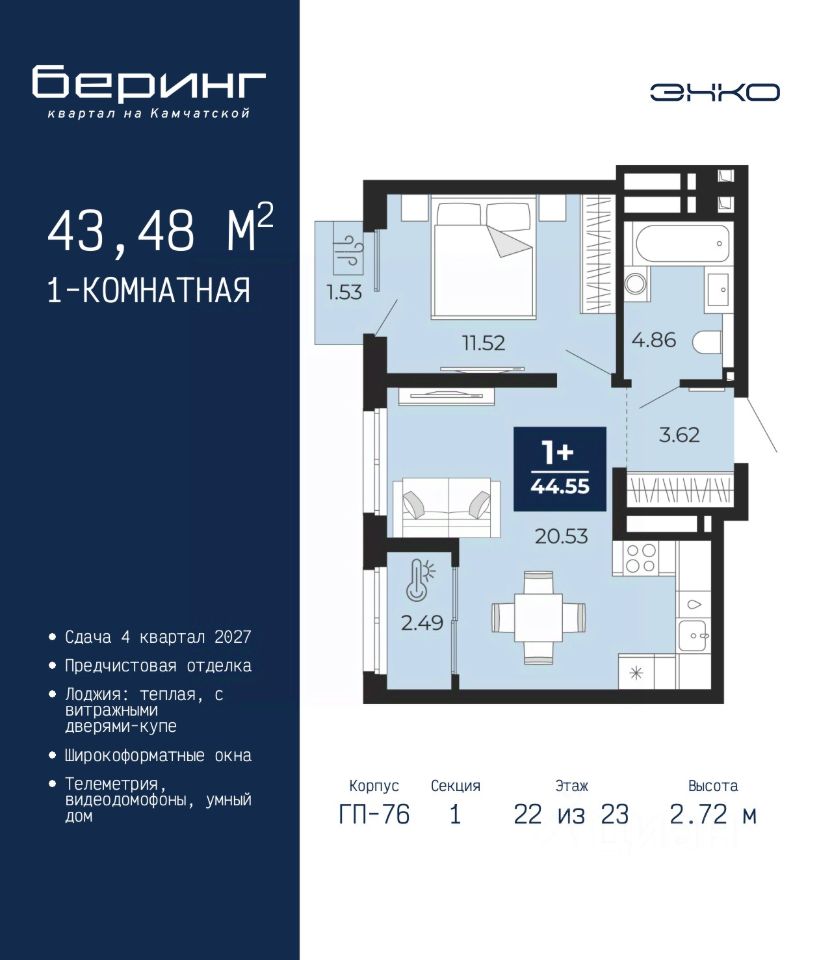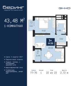 Продается 1-комн. квартира от застройщика с предчистовой отделкой в ЖК "Беринг" на 22 этаже. Общая площадь: 43.48 кв.м., жилая: 11.52 кв.м., площадь просторной кухни-столовой: 20.53 кв.м. Все окна выходят на одну сторону. В квартире один балкон и одна лоджия, один совмещенный санузел. Высота потолков 2.72 м.