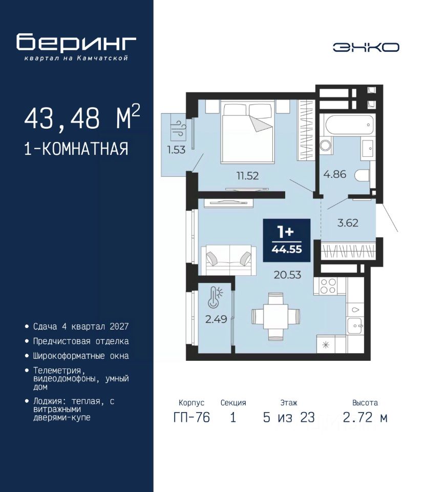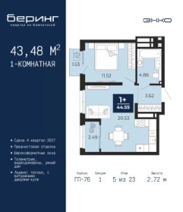 Просторная 1-комн. квартира с предчистовой отделкой в ЖК "Беринг" на 5 этаже. Общая площадь: 43.48 кв.м., жилая: 11.52 кв.м., площадь просторной кухни-столовой: 20.53 кв.м. Все окна выходят на одну сторону. В квартире один балкон и одна лоджия, один совмещенный санузел. Высота потолков 2.72 м.