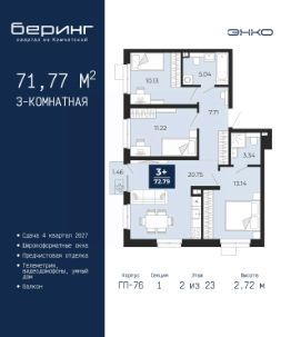 Просторная трехкомнатная квартира с предчистовой отделкой в ЖК "Беринг" на 2 этаже. Общая площадь: 71.77 кв.м., жилая: 34.49 кв.м., площадь просторной кухни-столовой: 20.75 кв.м. Квартира угловая, очень светлая, естественная вентиляция при открытии окон. В квартире один балкон, два совмещенных санузла. Высота потолков 2.72 м.