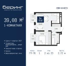 Продается 1-комн. квартира с предчистовой отделкой в ЖК "Беринг" на 2 этаже. Общая площадь: 39.08 кв.м., жилая: 10.92 кв.м., площадь просторной кухни-столовой: 18.6 кв.м. Все окна выходят на одну сторону. В квартире два балкона, один совмещенный санузел. Высота потолков 2.72 м.