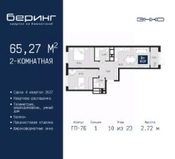 Продается двухкомнатная квартира от застройщика с предчистовой отделкой в ЖК "Беринг" на 10 этаже. Общая площадь: 65.27 кв.м., жилая: 27.59 кв.м., площадь просторной кухни-столовой: 18.13 кв.м. Квартира - распашонка, без проходных комнат, окна выходят на paзные стороны дома. В квартире один балкон, два совмещенных санузла. Высота потолков 2.72 м.