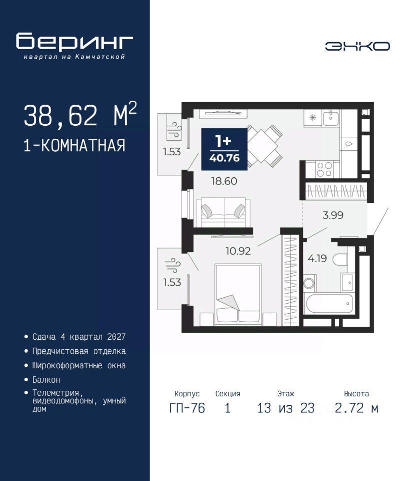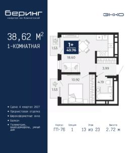Однокомнатная квартира с предчистовой отделкой в ЖК "Беринг" на 13 этаже. Общая площадь: 38.62 кв.м., жилая: 10.92 кв.м., площадь просторной кухни-столовой: 18.6 кв.м. Все окна выходят на одну сторону. В квартире два балкона, один совмещенный санузел. Высота потолков 2.72 м.