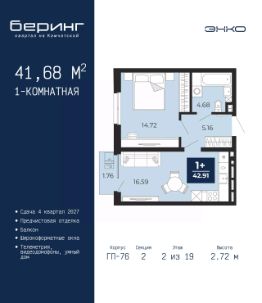Однокомнатная квартира с предчистовой отделкой в ЖК "Беринг" на 2 этаже. Общая площадь: 41.68 кв.м., жилая: 14.72 кв.м., площадь просторной кухни-столовой: 16.59 кв.м. Все окна выходят на одну сторону. В квартире один балкон, один совмещенный санузел. Высота потолков 2.72 м.