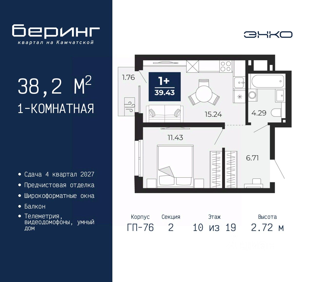 Однокомнатная квартира с предчистовой отделкой в ЖК "Беринг" на 10 этаже. Общая площадь: 38.2 кв.м., жилая: 11.43 кв.м., площадь просторной кухни-столовой: 15.24 кв.м. Все окна выходят на одну сторону. В квартире один балкон, один совмещенный санузел. Высота потолков 2.72 м.