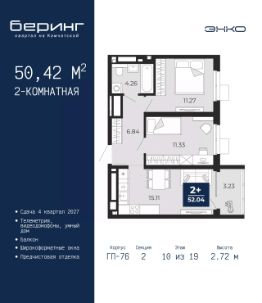 Продается двухкомнатная квартира с предчистовой отделкой в ЖК "Беринг" на 10 этаже. Общая площадь: 50.42 кв.м., жилая: 22.6 кв.м., площадь просторной кухни-столовой: 15.11 кв.м. Комнаты изолированные, все окна выходят на одну сторону. В квартире один балкон, один совмещенный санузел. Высота потолков 2.72 м.