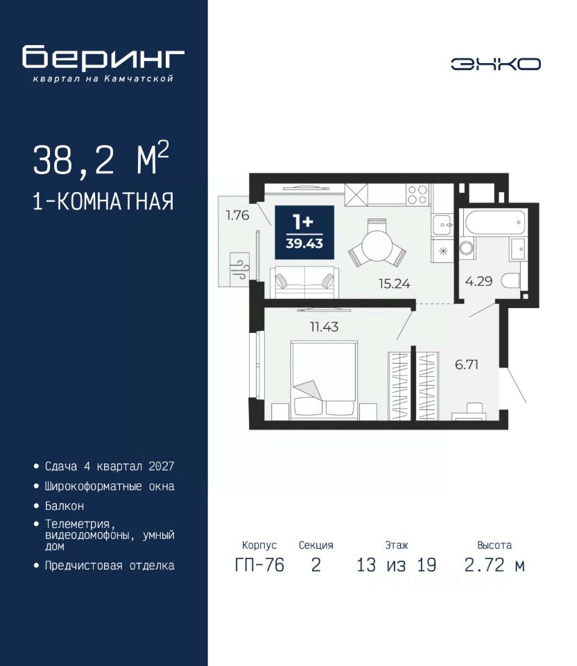 1-комн. квартира с предчистовой отделкой в ЖК "Беринг" на 13 этаже. Общая площадь: 38.2 кв.м., жилая: 11.43 кв.м., площадь просторной кухни-столовой: 15.24 кв.м. Все окна выходят на одну сторону. В квартире один балкон, один совмещенный санузел. Высота потолков 2.72 м.