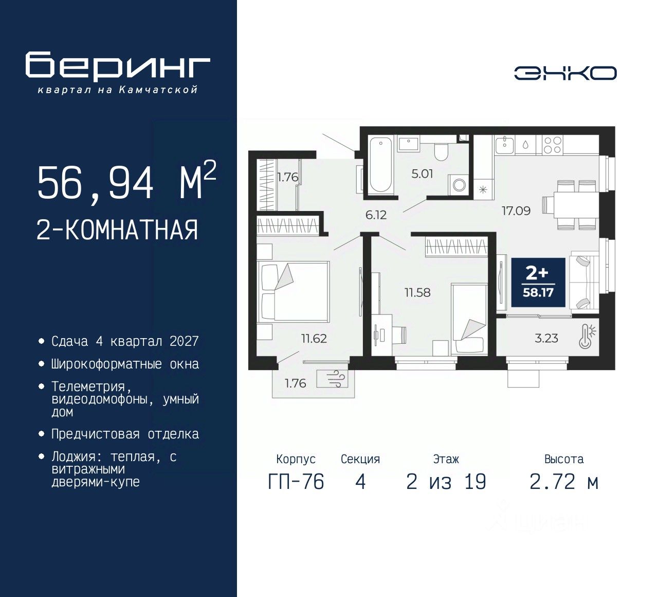 Продается двухкомнатная квартира с предчистовой отделкой в ЖК "Беринг" на 2 этаже. Общая площадь: 56.94 кв.м., жилая: 23.2 кв.м., площадь просторной кухни-столовой: 17.09 кв.м. Квартира угловая, идеально подойдет любителям тишины и панорамных видов. В квартире один балкон и одна лоджия, один совмещенный санузел. Высота потолков 2.72 м.