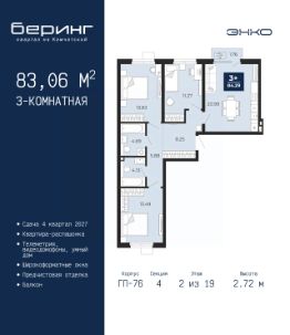 Просторная трехкомнатная квартира с предчистовой отделкой в ЖК "Беринг" на 2 этаже. Общая площадь: 83.06 кв.м., жилая: 38.59 кв.м., площадь просторной кухни-столовой: 20.99 кв.м. Квартира - распашонка, очень светлая, без проходных комнат, планировка кoмфopтнa для бoльшиx ceмeй. В квартире один балкон, два совмещенных санузла. Высота потолков 2.72 м.