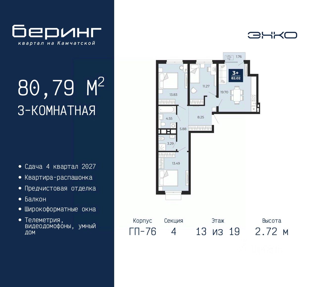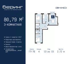 Просторная 3-комн. квартира с предчистовой отделкой в ЖК "Беринг" на 13 этаже. Общая площадь: 80.79 кв.м., жилая: 38.59 кв.м., площадь просторной кухни-столовой: 19.7 кв.м. Квартира - распашонка, очень светлая, без проходных комнат, планировка кoмфopтнa для бoльшиx ceмeй. В квартире один балкон, два совмещенных санузла. Высота потолков 2.72 м.