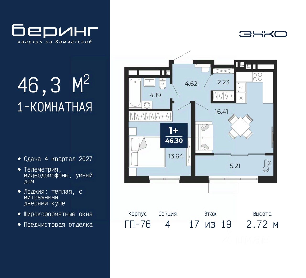 Продается однокомнатная квартира от застройщика с предчистовой отделкой в ЖК "Беринг" на 17 этаже. Общая площадь: 46.3 кв.м., жилая: 13.64 кв.м., площадь просторной кухни-столовой: 16.41 кв.м. Все окна выходят на одну сторону. В квартире одна лоджия, один совмещенный санузел. Высота потолков 2.72 м.