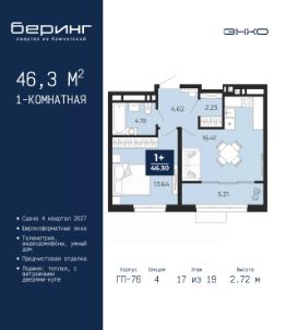 1-комн. квартира с предчистовой отделкой в ЖК "Беринг" на 17 этаже. Общая площадь: 46.3 кв.м., жилая: 13.64 кв.м., площадь просторной кухни-столовой: 16.41 кв.м. Все окна выходят на одну сторону. В квартире одна лоджия, один совмещенный санузел. Высота потолков 2.72 м.