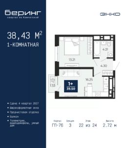 Продается 1-комн. квартира с предчистовой отделкой в ЖК "Беринг" на 22 этаже. Общая площадь: 38.43 кв.м., жилая: 13.21 кв.м., площадь просторной кухни-столовой: 16.25 кв.м. Все окна выходят на одну сторону. В квартире один балкон, один совмещенный санузел. Высота потолков 2.72 м.