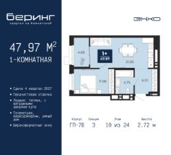 Просторная 1-комн. квартира с предчистовой отделкой в ЖК "Беринг" на 10 этаже. Общая площадь: 47.97 кв.м., жилая: 11.08 кв.м., площадь просторной кухни-столовой: 21.3 кв.м. Все окна выходят на одну сторону. В квартире одна лоджия, один совмещенный санузел. Высота потолков 2.72 м.