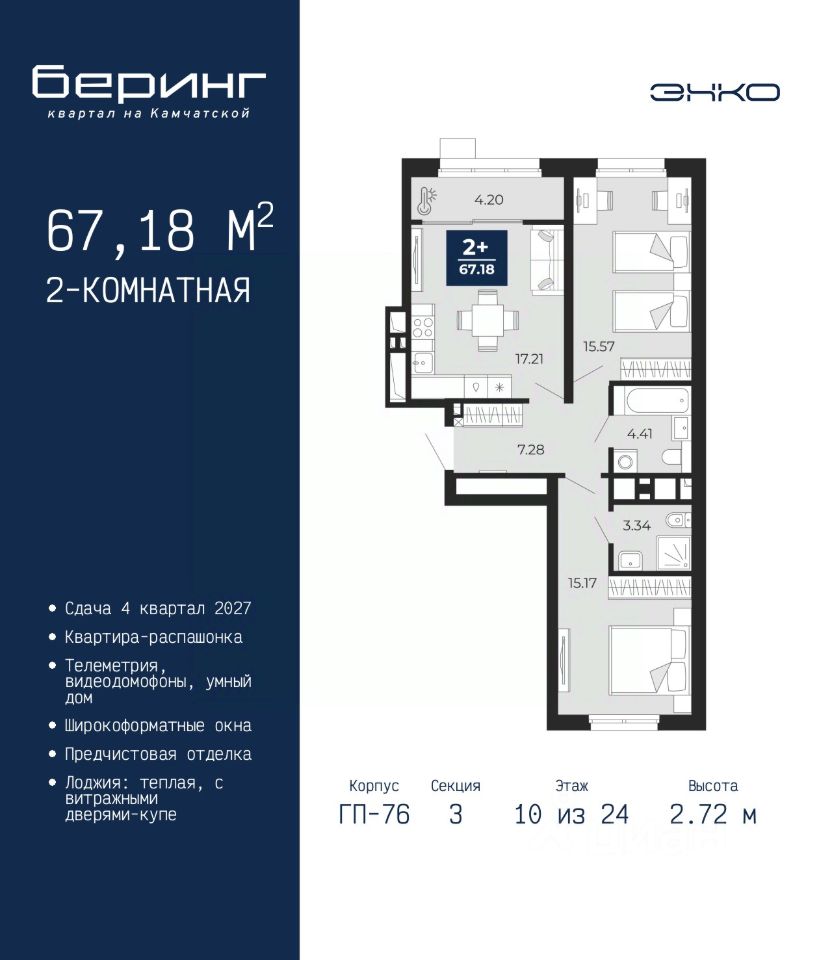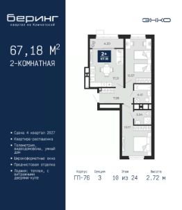 2-комн. квартира с предчистовой отделкой в ЖК "Беринг" на 10 этаже. Общая площадь: 67.18 кв.м., жилая: 30.74 кв.м., площадь просторной кухни-столовой: 17.21 кв.м. Квартира - распашонка, без проходных комнат, окна выходят на paзные стороны дома. В квартире одна лоджия, два совмещенных санузла. Высота потолков 2.72 м.