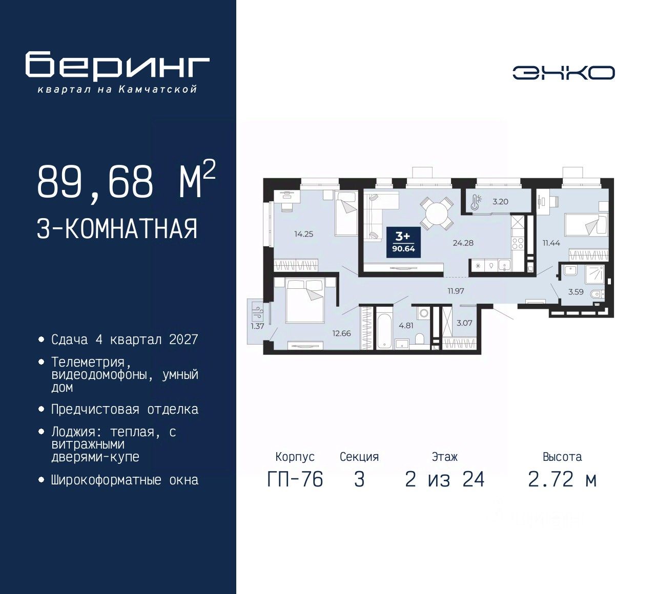 3-комн. квартира от застройщика с предчистовой отделкой в ЖК "Беринг" на 2 этаже. Общая площадь: 89.68 кв.м., жилая: 38.35 кв.м., площадь просторной кухни-столовой: 24.28 кв.м. Угловая квартира, очень светлая, естественная вентиляция при открытии окон. В квартире один балкон и одна лоджия, два совмещенных санузла. Высота потолков 2.72 м.