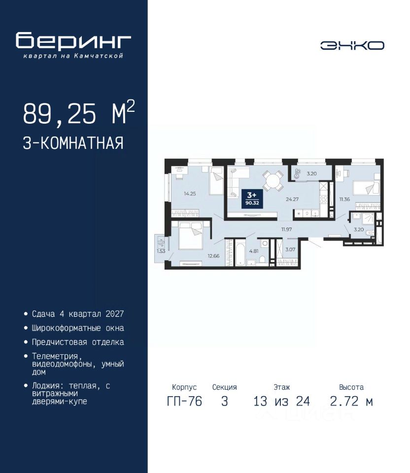Просторная 3-комн. квартира с предчистовой отделкой в ЖК "Беринг" на 13 этаже. Общая площадь: 89.25 кв.м., жилая: 38.27 кв.м., площадь просторной кухни-столовой: 24.27 кв.м. Квартира угловая, идеально подойдет любителям тишины и панорамных видов. В квартире один балкон и одна лоджия, два совмещенных санузла. Высота потолков 2.72 м.