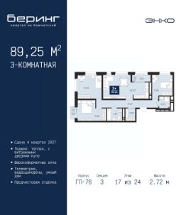 Продается трехкомнатная квартира с предчистовой отделкой в ЖК "Беринг" на 17 этаже. Общая площадь: 89.25 кв.м., жилая: 38.27 кв.м., площадь просторной кухни-столовой: 24.27 кв.м. Угловая квартира, идеально подойдет любителям тишины и панорамных видов. В квартире один балкон и одна лоджия, два совмещенных санузла. Высота потолков 2.72 м.
