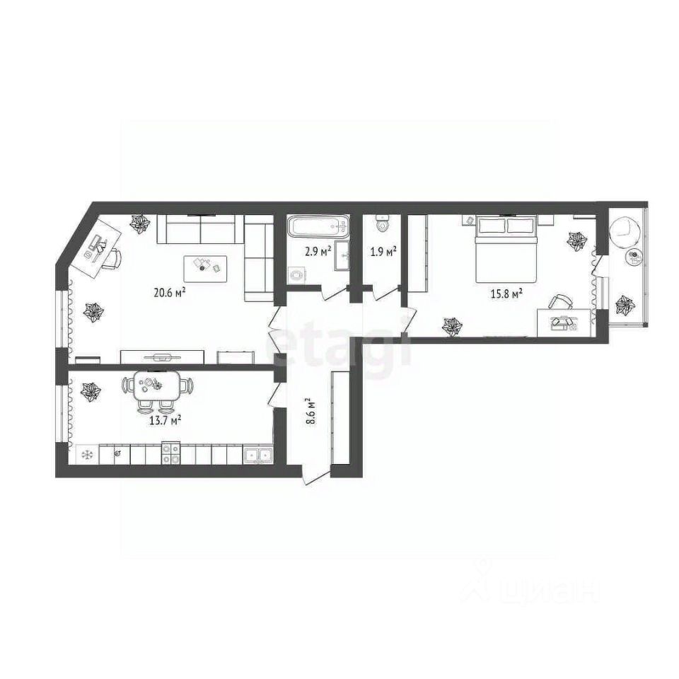 Кухня - 13,2 кв., гостиная- 20,7 и спальня 15 кв.м с выходом на балкон 4. Абсолютно все, что Вы видите на фотографиях остается после продажи новым собственникам: мебель, бытовая техника, осветительные приборы, оконный текстиль.