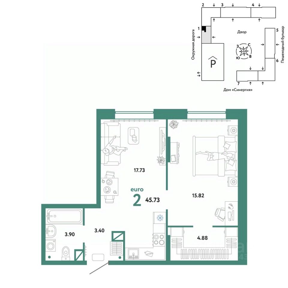 Продается 2комнатная квартира на 6 этаже от застройщика Страна Девелопмент. Площадь квартиры 45,73 кв. м.