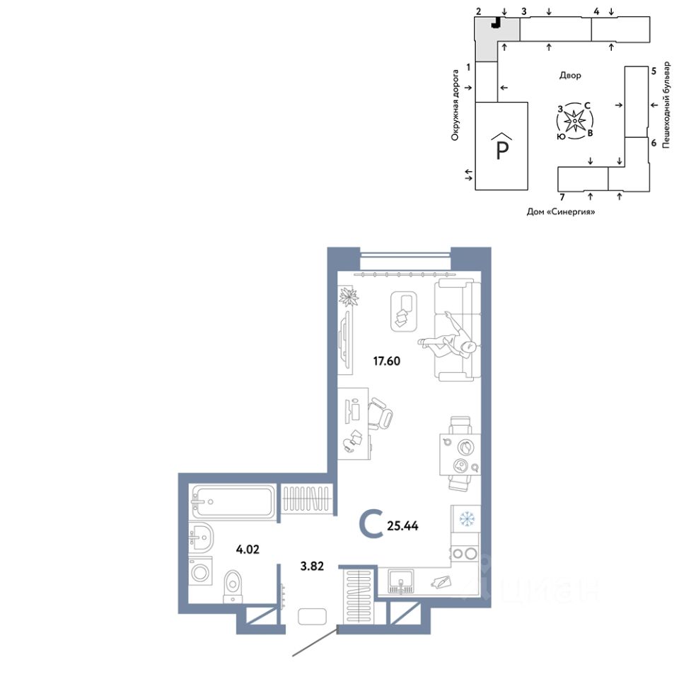 Продается студия на 12 этаже от застройщика Страна Девелопмент. Площадь квартиры 25,44 кв. м.
