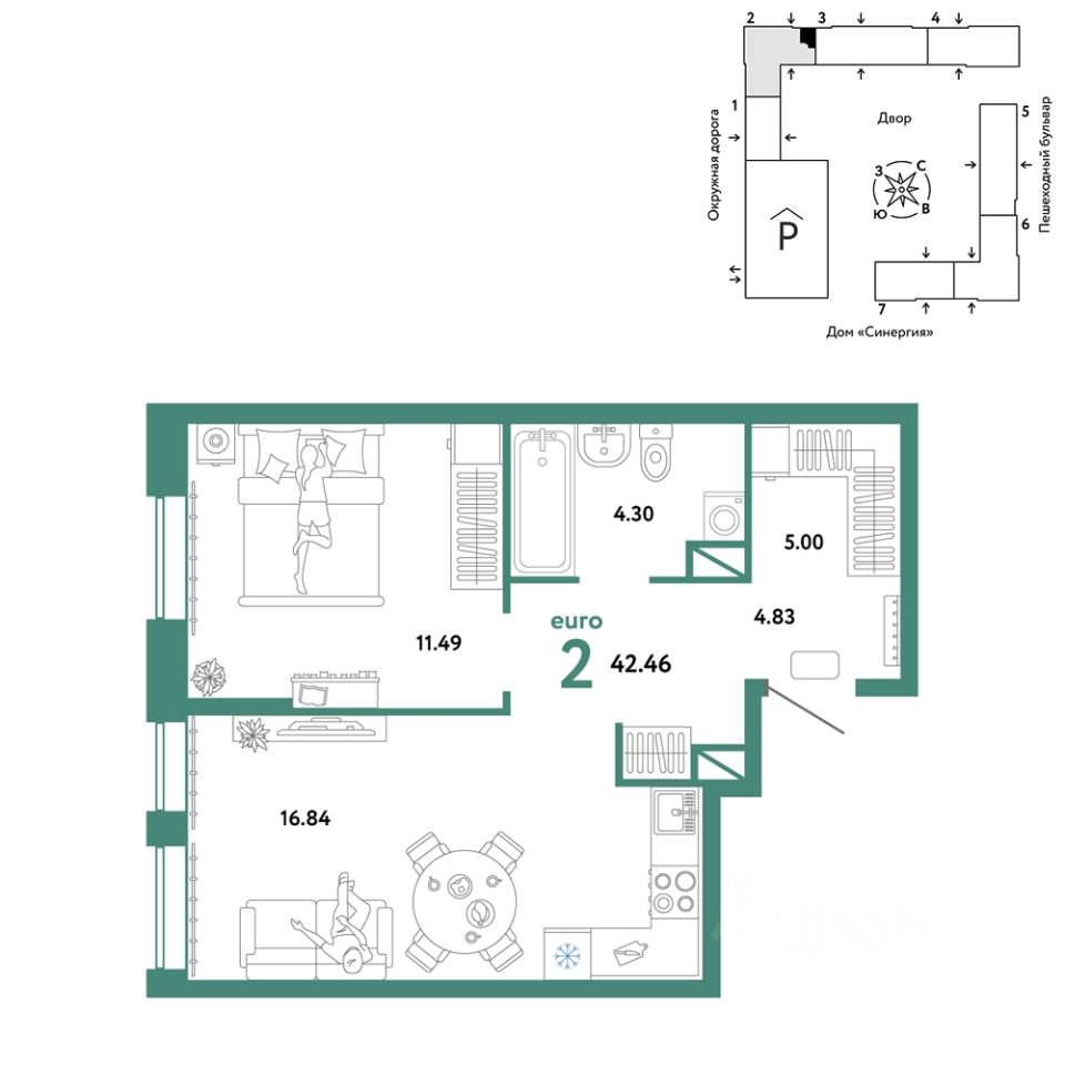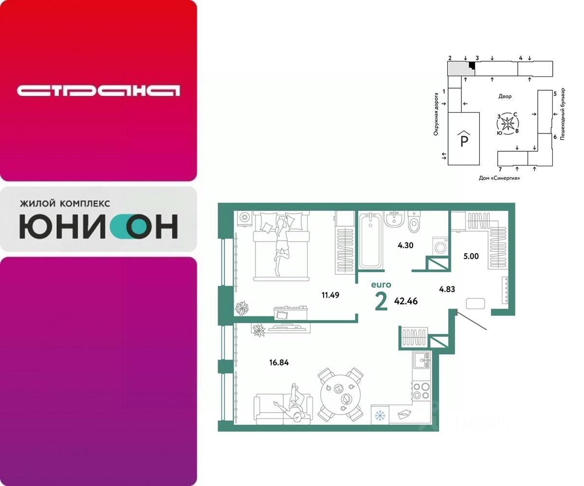 Продается 2комнатная квартира на 14 этаже от застройщика Страна Девелопмент. Площадь квартиры 42,46 кв. м.
