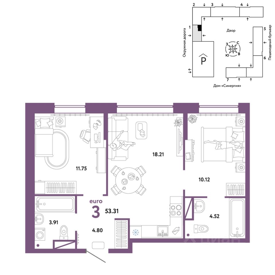 Продается 3комнатная квартира на 12 этаже от застройщика Страна Девелопмент. Площадь квартиры 53,31 кв. м.
