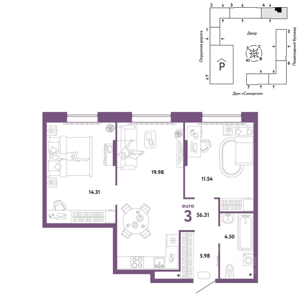Продается 3комнатная квартира на 2 этаже от застройщика Страна Девелопмент. Площадь квартиры 56,31 кв. м.