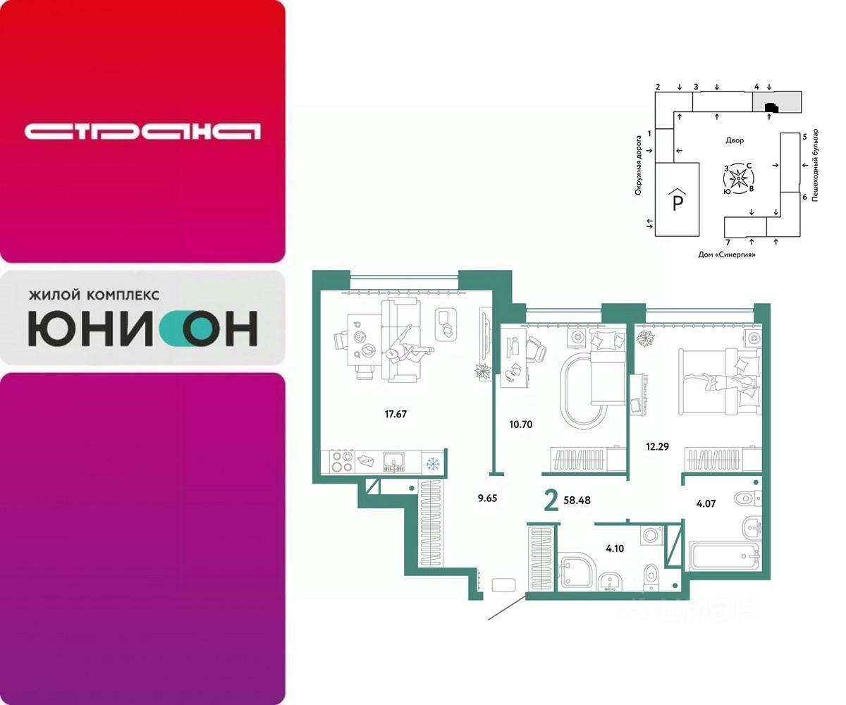 Продается 2комнатная квартира на 4 этаже от застройщика Страна Девелопмент. Площадь квартиры 58,48 кв. м.