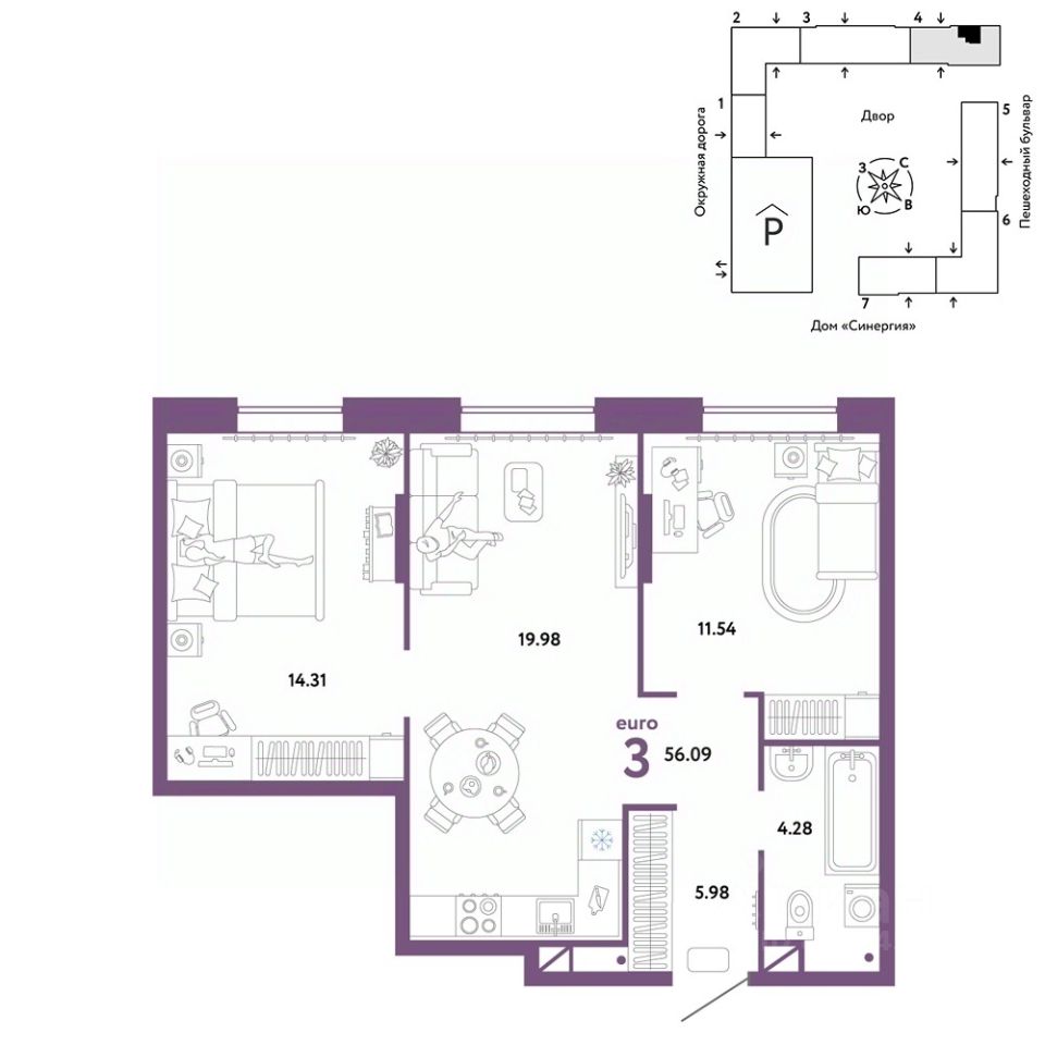 Продается 3комнатная квартира на 6 этаже от застройщика Страна Девелопмент. Площадь квартиры 56,09 кв. м.
