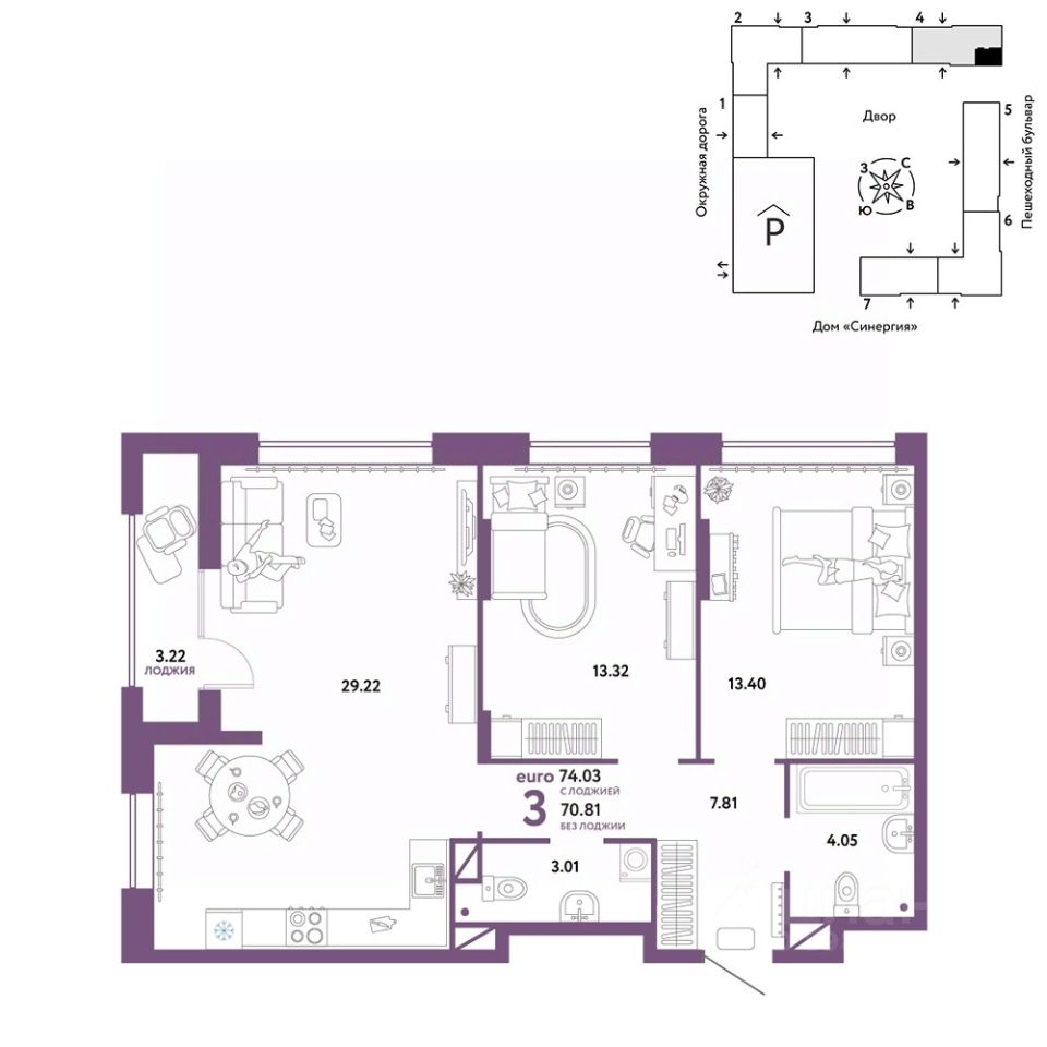 Продается 3комнатная квартира на 12 этаже от застройщика Страна Девелопмент. Площадь квартиры 74,03 кв. м.