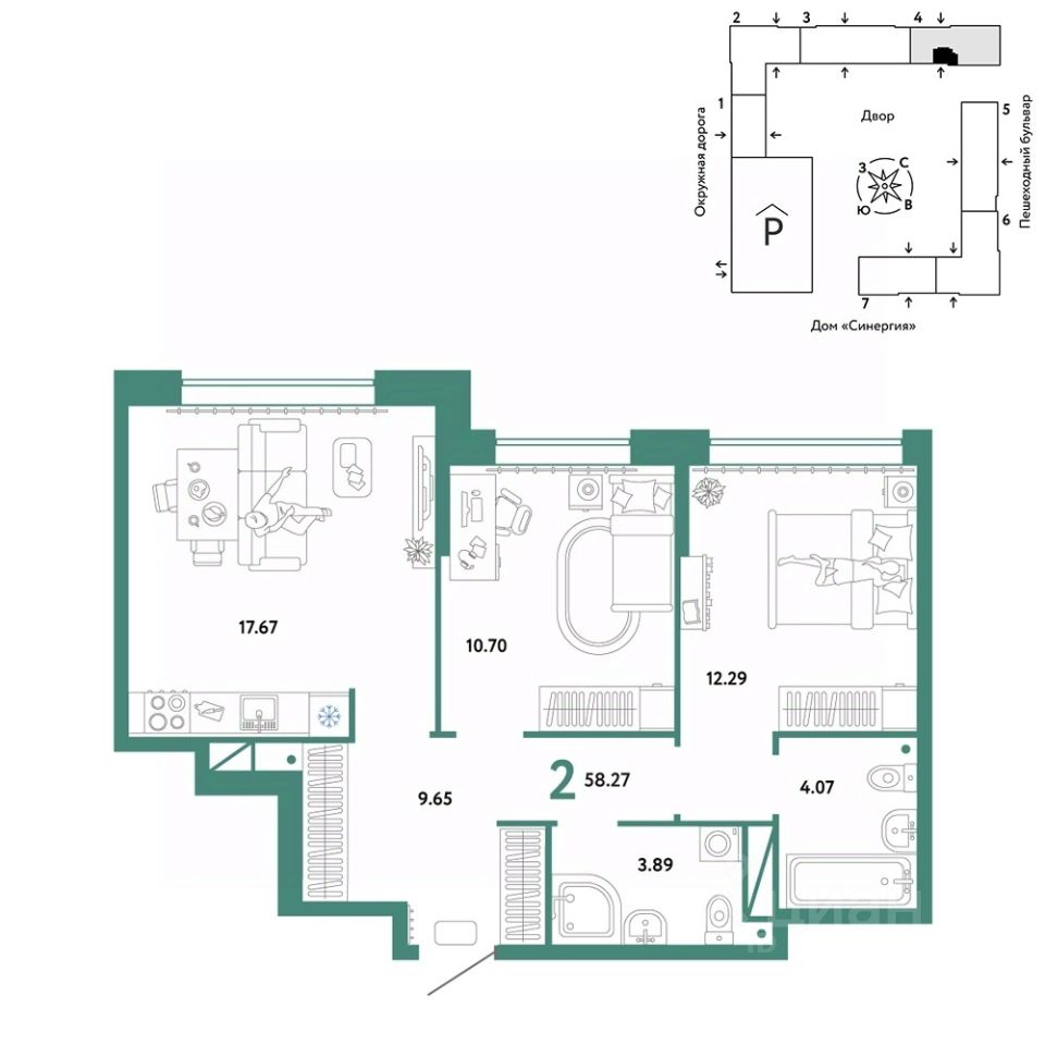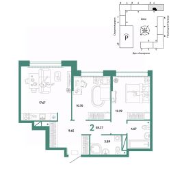 Продается 2комнатная квартира на 16 этаже от застройщика Страна Девелопмент. Площадь квартиры 58,27 кв. м.