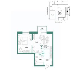 Продается 2комнатная квартира на 4 этаже от застройщика Страна Девелопмент. Площадь квартиры 35,64 кв. м.
