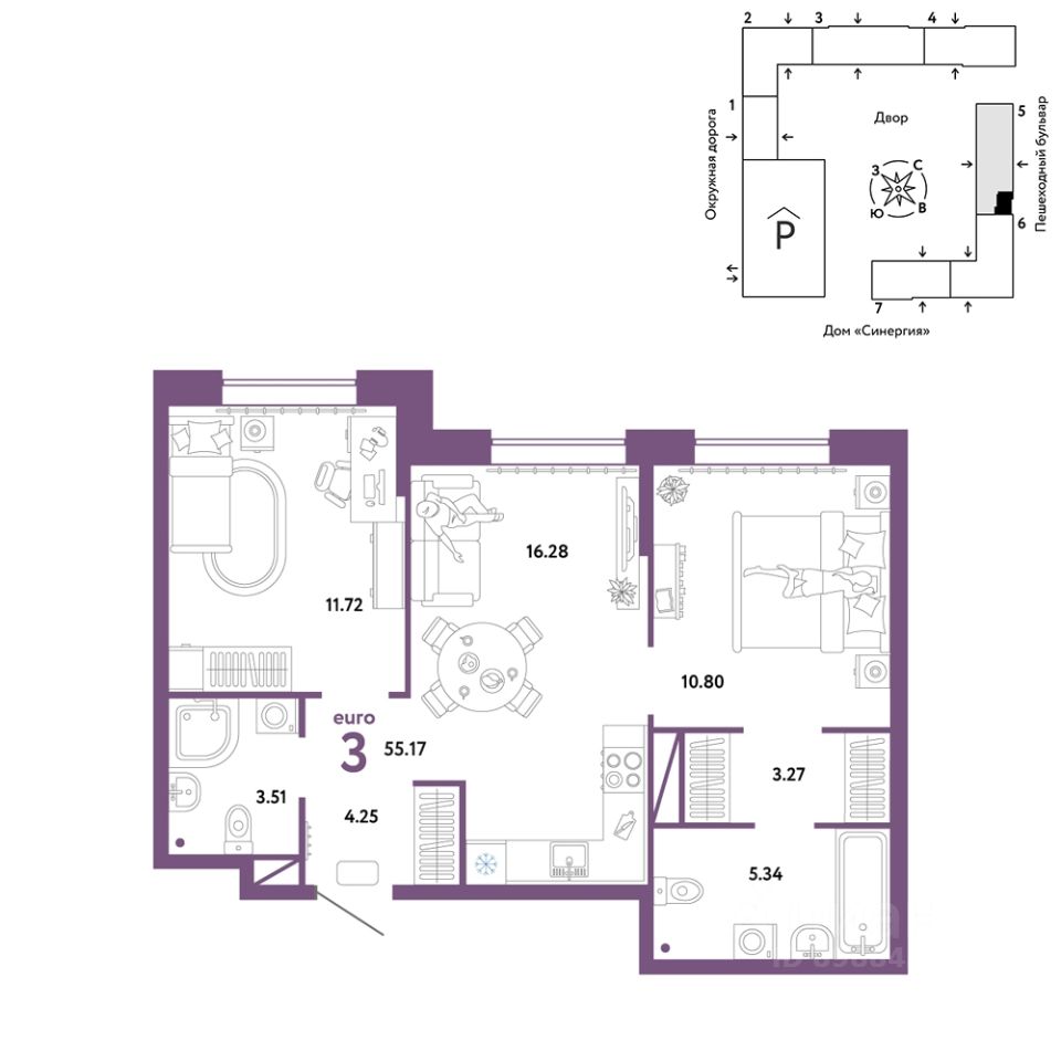 Продается 3комнатная квартира на 6 этаже от застройщика Страна Девелопмент. Площадь квартиры 55,17 кв. м.