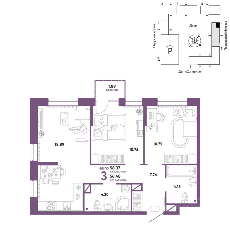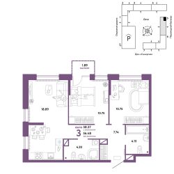 Продается 3комнатная квартира на 7 этаже от застройщика Страна Девелопмент. Площадь квартиры 58,37 кв. м.