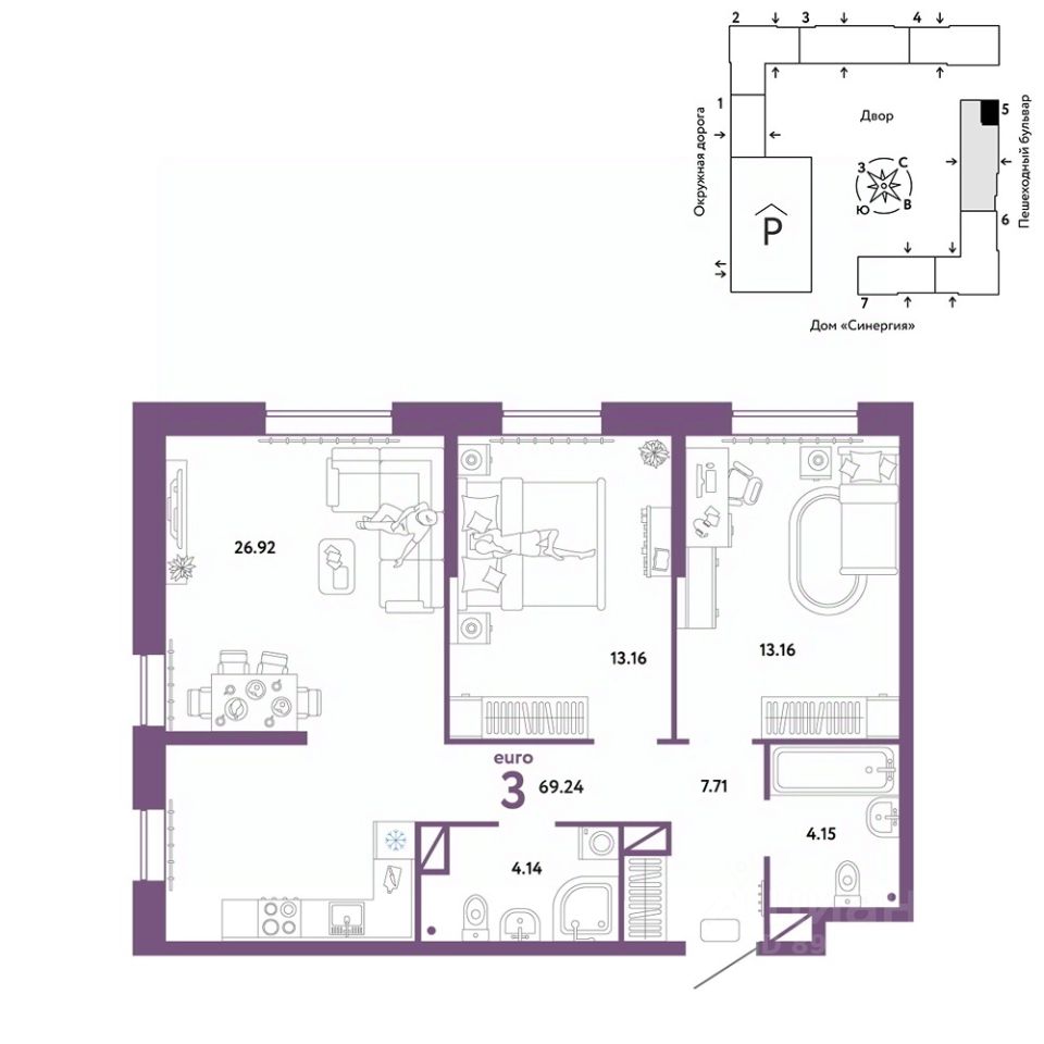 Продается 3комнатная квартира на 13 этаже от застройщика Страна Девелопмент. Площадь квартиры 69,24 кв. м.
