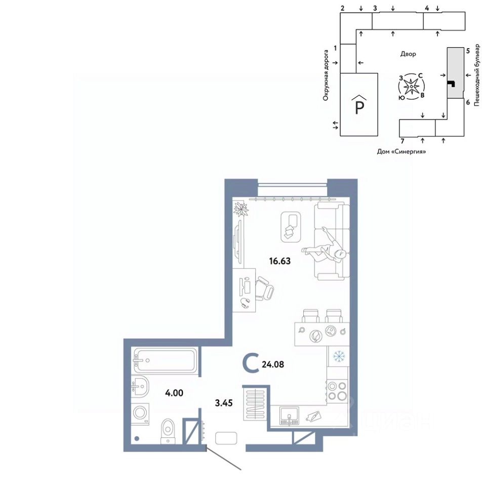 Продается студия на 16 этаже от застройщика Страна Девелопмент. Площадь квартиры 24,08 кв. м.