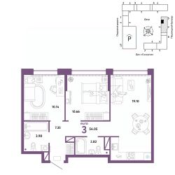 Продается 3комнатная квартира на 16 этаже от застройщика Страна Девелопмент. Площадь квартиры 54,05 кв. м.