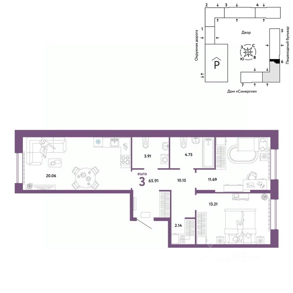 Продается 3комнатная квартира на 2 этаже от застройщика Страна Девелопмент. Площадь квартиры 65,91 кв. м.