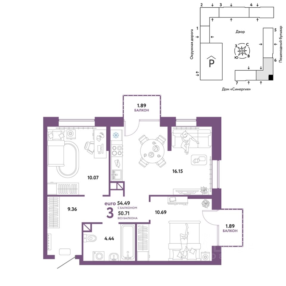 Продается 3комнатная квартира на 4 этаже от застройщика Страна Девелопмент. Площадь квартиры 54,49 кв. м.